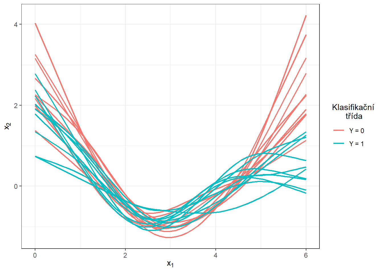 Obrázek 2.2: Prvních 10 vygenerovaných pozorování z každé ze dvou klasifikačních tříd. Pozorovaná data nejsou vyhlazená.